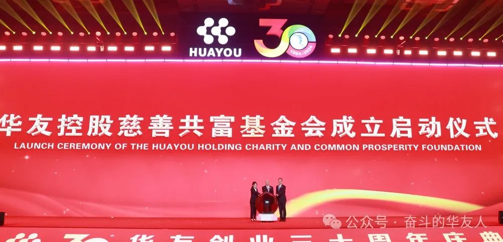 慶典最后,華友控股慈善共富基金會的正式啟動。華友控股董事長陳雪華,副董事長陳曉琳,總裁陳紅良,共同上臺,共觸希望之光,按下啟動球,標(biāo)志著愛與責(zé)任的傳遞。