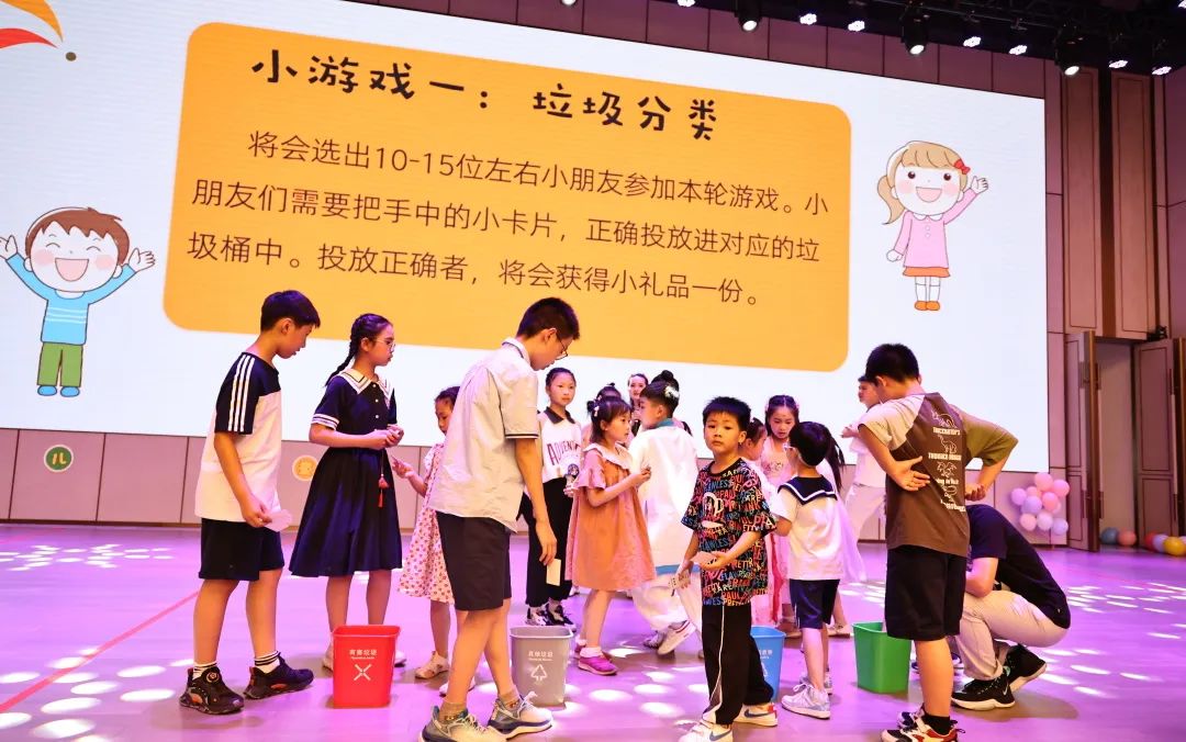 在接下來穿插的“小螃蟹運球”、“你拋我接”、“夾球跳”以及“保齡球”等小游戲環節中,小朋友和家長出色的配合表現讓現場不時爆發熱烈的掌聲。小朋友們勇于挑戰,努力拼搏,與家長間的親情互動更是把整場晚會推向高潮。期間,更有寓教于樂的垃圾分類、安全隱患識別大挑戰等搶答環節,進一步增強小朋友們的垃圾分類意識和安全意識。
