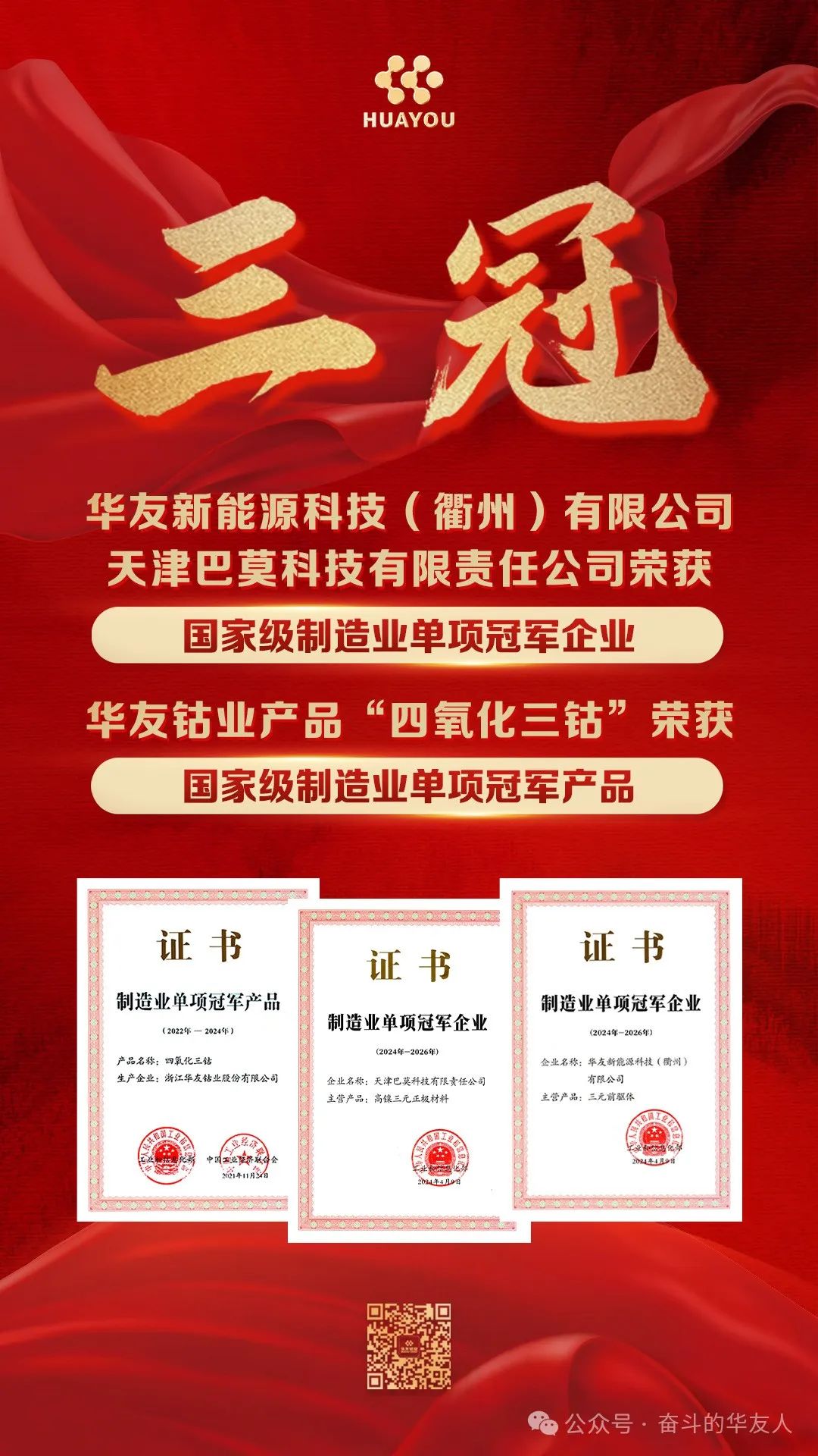 近日,華友鈷業(yè)旗下公司華友新能源科技(衢州)有限公司、天津巴莫科技有限責(zé)任公司雙雙獲得工信部正式頒發(fā)的“制造業(yè)單項(xiàng)冠軍企業(yè)”證書。此前,華友鈷業(yè)的“四氧化三鈷”已摘得“制造業(yè)單項(xiàng)冠軍產(chǎn)品”桂冠。