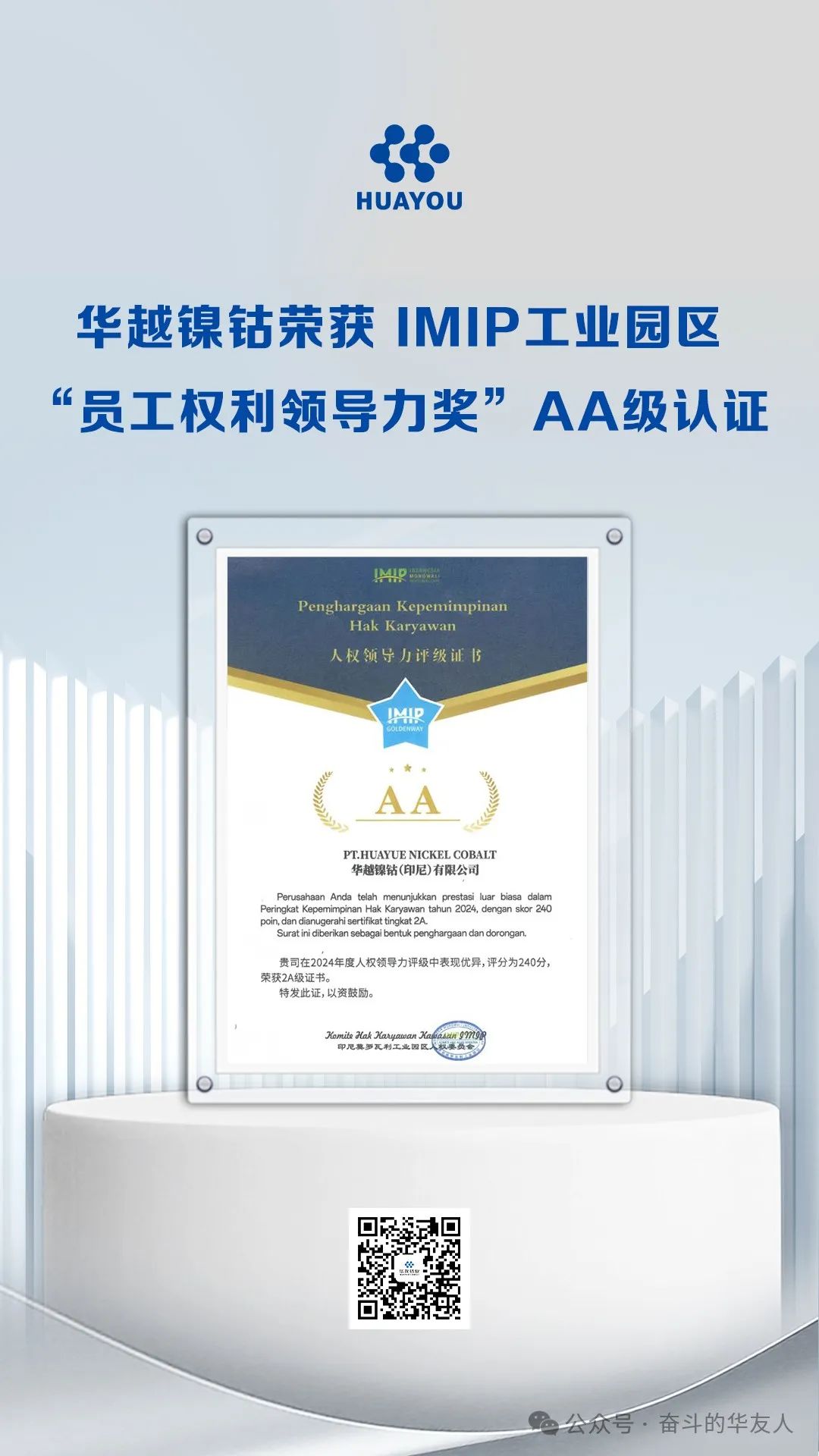 近日,華越鎳鈷(印尼)有限公司憑借卓越的員工管理體系與人權(quán)保障實(shí)踐,在2024 年度 IMIP 印尼莫羅瓦利工業(yè)園區(qū)人權(quán)委員會組織的員工權(quán)利領(lǐng)導(dǎo)力評級評選中脫穎而出,榮獲 AA 級認(rèn)證,并取得 240 分的優(yōu)異成績,充分彰顯了公司在人力資源管理及員工權(quán)益保障領(lǐng)域的領(lǐng)先地位。