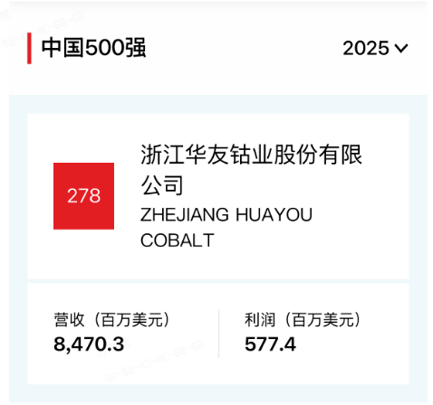 上升!華友鈷業(yè)榮登2025年《財(cái)富》中國(guó)500強(qiáng)第278位