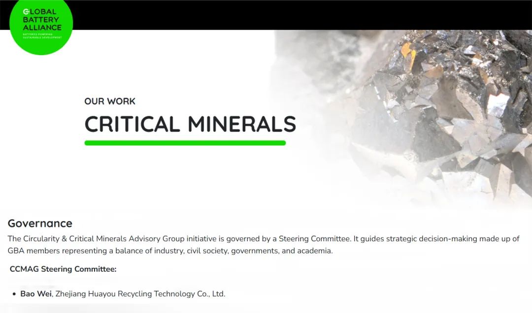 近期,經全球電池聯盟(GBA)董事會一致提名并批準,華友循環正式加入其核心工作機構——“循環與關鍵礦產(CCMAG)指導委員會”,標志著華友循環在全球電池產業鏈可持續發展中的領導地位再獲國際權威認可。