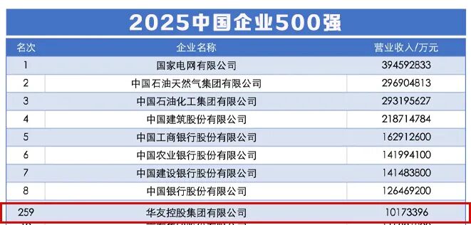 9月15日,中國企業聯合會發布了“2025中國企業500強”榜單,華友控股集團有限公司以2024年1017.34億元的營業收入榮登該榜單,位列第259位。據悉,2025中國企業500強營業收入達110.15萬億元,入圍門檻實現23連升,達479.60億元,提升5.79億元。